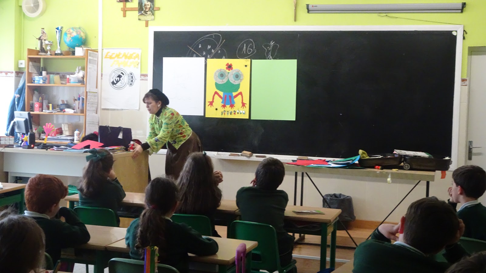 Todo comenzó con una simple pregunta: ¿Qué creéis que querrá ser la cartulina?, en ese instante la imaginación de los alumnos echó a volar, con la colaboración de todo el grupo, idea a idea, Violeta iba dando forma a algo que todavía en ese momento nos resultaba una incógnita. Con cada elemento que añadía la autora, la expectación y el interés iba en aumento. Poco a poco fue apareciendo y por fin, aquel conglomerado de ideas convertidas en papel, tomó forma revelando la misteriosa y magnífica figura de un gato, con sus ojos saltones de camaleón.